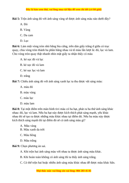 Bài 5: Trộn ánh sáng đỏ với ánh sáng vàng sẽ được ánh sáng màu nào dưới đây? A. Đỏ B. Vàng C. Da cam D. Lục