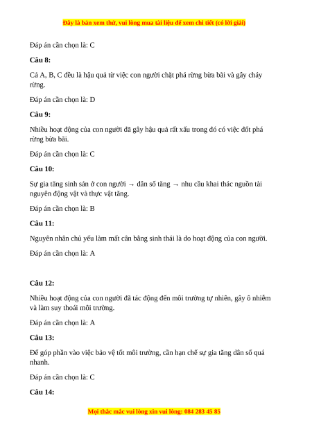 D. Phá rừng để lấy đất trồng trọt cần phải được khuyến khích LỜI GIẢI CHI TIẾT Câu 1: