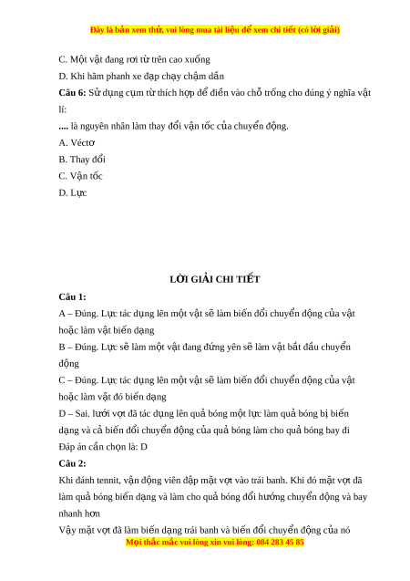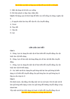 .... là nguyên nhân làm thay đổi v n t ậ ốc c a ủ chuy n đ ể ng. ộ A. Véctơ B. Thay đổi C. V n ậ tốc D. L c ự L I Ờ GIẢI CHI TI T Ế Câu 1: A – Đúng. L c t ự ác d ng ụ lên m t ộ v t ậ s l ẽ àm bi n ế đ i ổ chuy n đ ể ng ộ c a v ủ t ậ ho c l ặ àm v t ậ bi n d ế ng ạ B – Đúng. L c s ự ẽ làm m t ộ v t ậ đang đ ng yên s ứ ẽ làm v t ậ b t ắ đ u chuy ầ n ể đ ng ộ C – Đúng. L c t ự ác d ng ụ lên m t ộ v t ậ s l ẽ àm bi n ế đ i ổ chuy n đ ể ng ộ c a v ủ t ậ ho c l ặ àm v t ậ đó bi n d ế ng ạ D – Sai. lư i ớ v t ợ đã tác d ng l ụ ên qu bóng m ả t ộ l c ự làm qu bóng b ả bi ị n ế d ng và c ạ bi ả n đ ế ổi chuy n đ ể ng c ộ a ủ qu bóng l ả àm cho qu bóng bay đi ả Đáp án cần ch n ọ là: D Câu 2: Khi đánh tennit, v n đ ậ ng ộ viên đ p m ậ t ặ v t