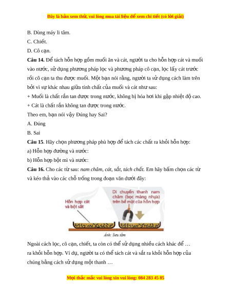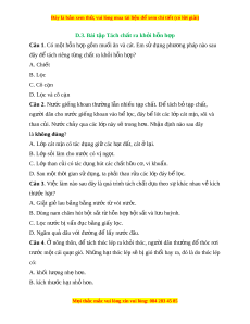 ặ . Theo em, lõi bông đó có tác d ng gì ụ ? A. L c ch ọ ất tan trong nư c. ớ B. L c ch ọ ất không tan trong nư c. ớ C. L c và gi ọ l ữ i ạ khoáng chất. D. L c hoá ch ọ ất đ c ộ h i ạ . Câu 12. N u ế không may làm đ d ổ u ăn vào n ầ ư c, ớ ta dùng phư ng pháp ơ nào đ ể tách riêng d u ăn r ầ a kh i ỏ nư c? ớ A. L c. ọ B. Dùng máy li tâm. C. Chi t ế . D. Cô c n. ạ Câu 13. Phư ng ơ pháp nào dư i ớ đây là đ n ơ gi n nh ả t ấ đ t ể ách cát l n t ẫ rong nư c? ớ A. L c. ọ M i ọ thắc m c