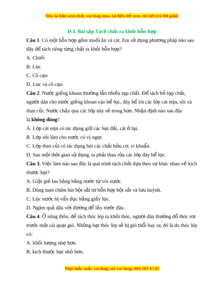 Đây là bản xem th , vu ử i lòng mua tài li u ệ đ xe ể m chi ti t (c ế ó l i ờ gi i ả ) D.3. Bài t p ậ Tách ch t ấ ra kh i ỏ h n h ỗ p ợ Câu 1. Có m t ộ hỗn h p ợ g m ồ mu i ố ăn và cát. Em s d ử ng ụ phư ng pháp nào s ơ au