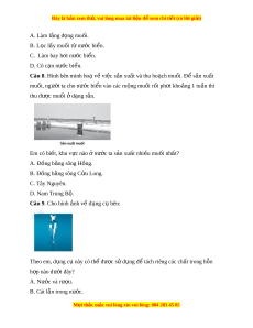 Câu 8. Hình bên minh hoạ v vi ề c s ệ n ả xu t ấ và thu ho ch m ạ u i ố . Đ s ể n xu ả t ấ muối, ngư i ờ ta cho nư c ớ bi n vào các ể ru ng ộ mu i ố r i ố ph i ơ kho ng ả 1 tu n t ầ hì thu đư c ợ muối ở d ng r ạ n. ắ Em có bi t ế , khu v c nào ự ở nư c t ớ a s n xu ả t ấ nhi u m ề u i ố nh t ấ ? A. Đồng b ng ằ sông Hồng. B. Đồng b ng s ằ ông C u L ử ong. C. Tây Nguyên. D. Nam Trung B . ộ Câu 9. Cho hình nh v ả d ề ng c ụ ụ bên: Theo em, d ng c ụ ụ này có th đ ể ư c ợ s d ử ng đ ụ ể tách riêng các ch t ấ trong h n ỗ h p ợ nào dư i ớ đây? A. Nư c ớ và rư u. ợ B. Cát lẫn trong nước. M i ọ thắc m c