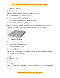 đây để tách riêng t ng ch ừ t ấ ra kh i ỏ h n h ỗ p? ợ A. Chi t ế B. L c ọ C. Cô c n ạ D. L c và cô ọ c n ạ Câu 2. Nư c ớ gi ng khoan t ế hư ng ờ l n nhi ẫ u t ề p ạ ch t ấ . Đ t ể ách b t ỏ p ạ ch t ấ , ngư i ờ dân cho nư c ớ gi ng ế khoan vào b l ể c, đáy ọ b l ể ót các l p cát ớ m n, s ị ôi và than c i ủ . Nư c ch ớ y ả qua các l p này s ớ t ẽ rong h n. N ơ h n ậ đ nh nào ị sau đây là không đúng? A. L p cát ớ mịn có tác d ng ụ giữ các h t ạ đ t ấ , cát ở l i ạ . B. L p s ớ i ỏ làm cho nư c ớ có v ng ị t ọ . C. L p t ớ han c i ủ có tác d ng hút ụ các ch t ấ h u c ữ , vi ơ khu n. ẩ D. Sau m t ộ th i ờ gian s d ử ng, t ụ a ph i ả thau r a các l ử p ớ đáy b l ể c. ọ