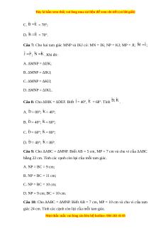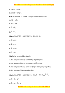Câu 5: Hai tam giác b ng nhau l ằ à: A. Hai tam giác có ba c p c ặ nh ạ tư ng ơ ng b ứ ng ằ nhau; B. Hai tam giác có ba c p ặ góc tư ng ơ ng b ứ ng ằ nhau; C. Hai tam giác có ba c p ặ c nh, ba c ạ p góc t ặ ư ng ơ ng b ứ ng nhau; ằ