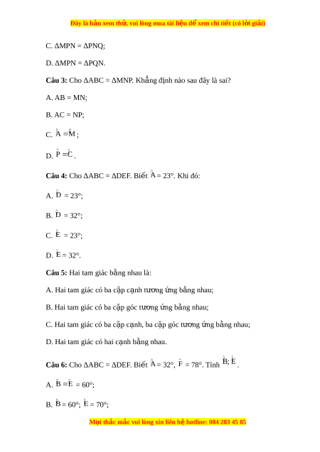 Câu 4: Cho ∆ABC = ∆DEF. Bi t ế A = 23°. Khi đó: A. D = 23°; B. D = 32°; C. E = 23°; D. E = 32°.