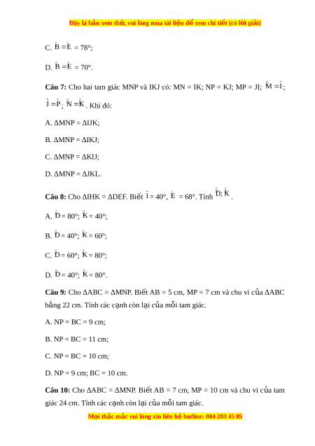 Câu 7: Cho hai tam giác MNP và IKJ có: MN = IK; NP = KJ; MP = JI; M I ; J P ; N K . Khi đó: A. ∆MNP = ∆IJK; B. ∆MNP = ∆IKJ; C. ∆MNP = ∆KIJ; D. ∆MNP = ∆JKL.