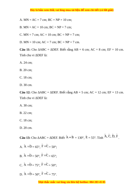 Câu 12: Cho ∆ABC = ∆DEF. Bi t r ng AB = 5 cm; AC = 12 cm; EF = 13 cm.ế ằ