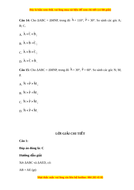 Câu 14: Cho ∆ABC = ∆MNP, trong đó