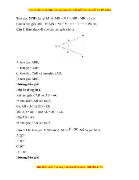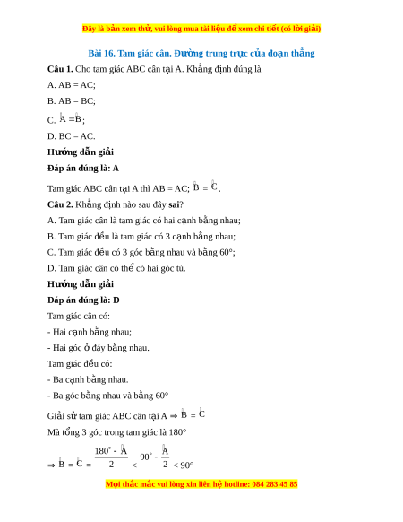 D. Tam giác cân có th có hai ể góc tù. Hư ng d ớ ẫn gi i ả Đáp án đúng là: D Tam giác cân có: - Hai c nh ạ b ng nhau; ằ - Hai góc đáy ở b ng nhau. ằ Tam giác đ u ề có: - Ba c nh b ạ ng ằ nhau. - Ba góc b ng nhau và b ằ ng ằ 60° Gi i ả s ử tam giác ABC cân t i ạ A ⇒ B = C