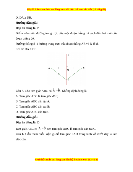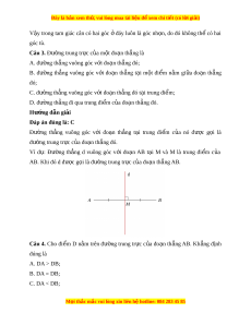 Đây là bản xem th , vu ử i lòng mua tài li u ệ đ xe ể m chi ti t (c ế ó l i ờ gi i ả ) D. DA ≥ DB. Hư ng d ớ ẫn gi i ả Đáp án đúng là: B Đi m ể n m ằ trên đư ng ờ trung tr c ự c a ủ m t ộ đo n ạ th ng ẳ thì cách đ u ề hai mút c a ủ đo n ạ th ng đó. ẳ Đư ng ờ th ng d l ẳ à đư ng ờ trung tr c c ự a ủ đo n t ạ h ng ẳ AB và D ∈ d. Khi đó DA = DB.