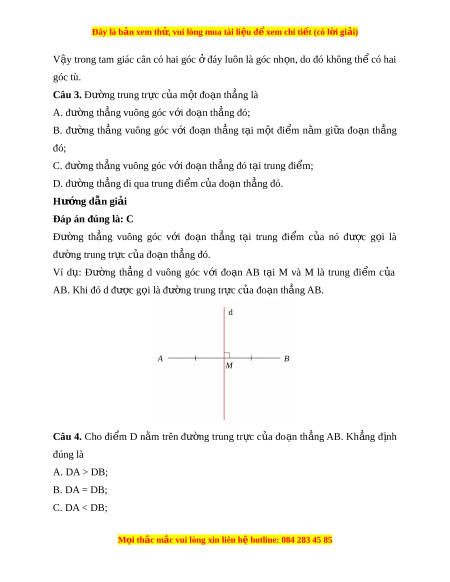 ậ trong tam giác cân có hai góc ở đáy luôn là góc nh n, ọ do đó không th có ể hai góc tù. Câu 3. Đư ng ờ trung tr c c ự a ủ m t ộ đo n t ạ h ng ẳ là A. đư ng ờ th ng vuông góc v ẳ i ớ đo n t ạ h ng đó ẳ ; B. đư ng ờ th ng ẳ vuông góc v i ớ đo n ạ th ng ẳ t i ạ m t ộ đi m ể n m ằ gi a ữ đo n ạ th ng ẳ đó; C. đư ng t ờ h ng ẳ vuông góc v i ớ đo n t ạ h ng ẳ đó t i ạ trung đi m ể ; D. đư ng ờ th ng đi ẳ qua trung đi m ể c a đo ủ n ạ th ng đó ẳ . Hư ng d ớ ẫn gi i ả Đáp án đúng là: C Đư ng ờ th ng ẳ vuông góc v i ớ đo n ạ th ng ẳ t i ạ trung đi m ể c a ủ nó đư c ợ g i ọ là đư ng ờ trung tr c c ự a ủ đo n t ạ h ng đó. ẳ Ví d : ụ Đư ng ờ th ng ẳ d vuông góc v i ớ đo n ạ AB t i ạ M và M là trung đi m ể c a ủ AB. Khi đó d đư c g ợ i ọ là đư ng t ờ rung tr c c ự a ủ đo n t ạ h ng ẳ AB. Câu 4. Cho đi m ể D n m ằ trên đư ng ờ trung tr c ự c a ủ đo n ạ th ng ẳ AB. Kh ng ẳ đ nh ị đúng là A. DA > DB; B. DA = DB; C. DA < DB; M i