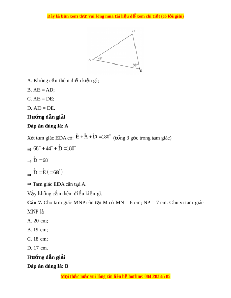 80 (tổng 3 góc trong tam giác) ⇒ 68 44 D 1 80 ⇒ D 6 8 ⇒ D E 6 8 ⇒ Tam giác EDA cân t i ạ A. V y ậ không c n t ầ hêm đi u ki ề n gì ệ .