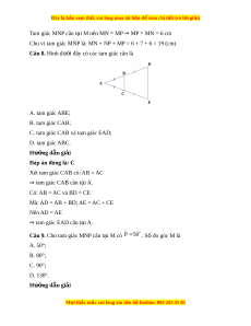 ạ M có MN = 6 cm; NP = 7 cm. Chu vi tam giác MNP là A. 20 cm; B. 19 cm; C. 18 cm; D. 17 cm. Hư ng d ớ ẫn gi i ả Đáp án đúng là: B M i