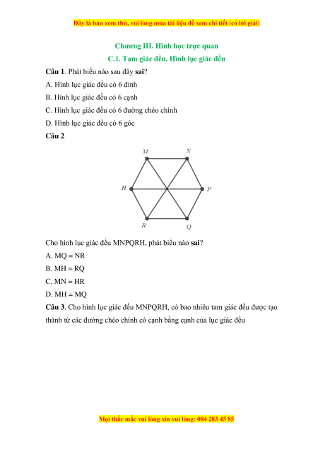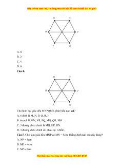 Câu 8. Hình lục giác đều có mấy cạnh A. 3 B. 5 C. 6 D. 8