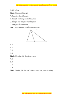 Câu 5. Cho tam giác đều MNP có MN = 5cm, khẳng định nào sau đây đúng? A. NP = 3cm B. MP = 4cm C. NP = 6cm