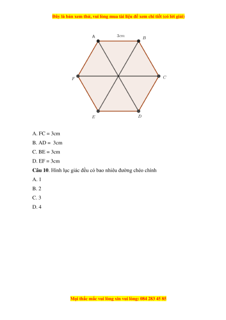 Câu 9. Cho lục giác đều ABCDEF có AB = 3cm, chọn câu đúng