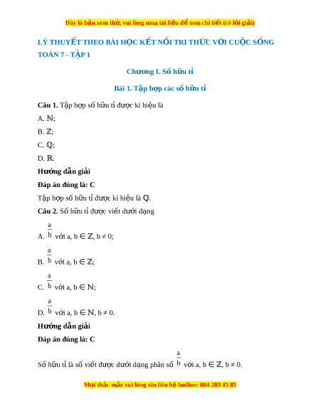 Ọ KẾT NỐI TRI TH C Ứ V I Ớ CU C Ộ S N Ố G TOÁN 7 - TẬP 1 Chư ng I ơ . S h ố u ữ tỉ Bài 1. T p h ậ p các ợ số h u t ữ ỉ Câu 1. T p h ậ p ợ số h u t ữ ỉ đư c kí ợ hi u l ệ à A. ℕ; B. ; ℤ C. ℚ; D. . ℝ Hư ng d ớ ẫn gi i ả Đáp án đúng là: C T p h ậ p ợ số h u t ữ ỉ đư c kí ợ hi u l ệ à . ℚ Câu 2. Số h u t ữ ỉ đư c vi ợ t ế dư i ớ d ng ạ a A. b v i ớ a, b ∈ ℤ, b ≠ 0; a B. b v i ớ a, b ∈ ℤ; a C. b v i ớ a, b ∈ ; ℕ a D. b v i ớ a, b ∈ , b ≠ ℕ 0. Hư ng d ớ ẫn gi i ả Đáp án đúng là: C a Số h u t ữ ỉ là số vi t ế đư c ợ dư i ớ d ng phân ạ s ố b v i ớ a, b ∈ , b ≠ ℤ 0. M i