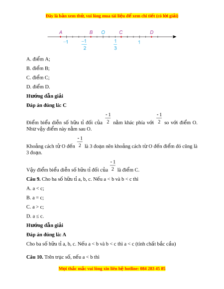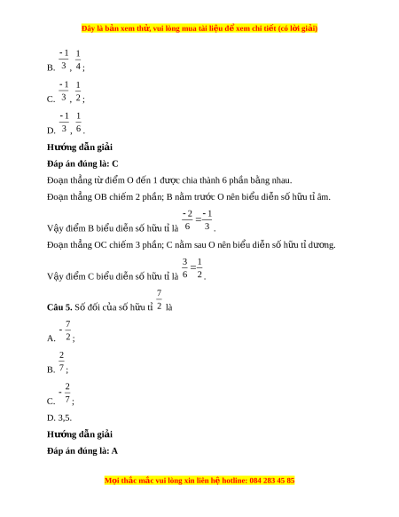 Đây là bản xem th , vu ử i lòng mua tài li u ệ đ xe ể m chi ti t (c ế ó l i ờ gi i ả ) 1 1 B. 3 , 4 ; 1 1 C. 3 , 2 ; 1 1 D. 3 , 6 . Hư ng d ớ ẫn gi i ả Đáp án đúng là: C Đo n ạ th ng t ẳ đi ừ m ể O đ n ế 1 đư c chi ợ a thành 6 ph n b ầ ng ằ nhau. Đo n ạ th ng O ẳ B chi m ế 2 ph n; ầ B n m ằ trư c ớ O nên bi u di ể n s ễ h ố u t ữ âm ỉ . 2 1 V y ậ đi m ể B bi u di ể n s ễ ố h u t ữ l ỉ à 6 3 . Đo n ạ th ng O ẳ C chi m ế 3 ph n; ầ C n m ằ sau O nên bi u di ể n ễ s h ố u t ữ d ỉ ư ng. ơ 3 1 V y ậ đi m ể C bi u di ể n s ễ ố h u t ữ l ỉ à 6 2 . 7 Câu 5. Số đối c a ủ s h ố u t ữ ỉ 2 là 7 A. 2 ; 2 B. 7 ; 2 C. 7 ; D. 3,5. Hư ng d ớ ẫn gi i ả Đáp án đúng là: A M i