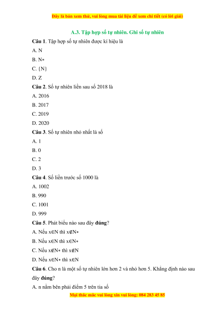 Câu 5. Phát biểu nào sau đây đúng? A. Nếu x∈N thì x∉N∗ B. Nếu x∈N thì x∈N∗ C. Nếu x∉N∗ thì x∉N D. Nếu x∈N∗ thì x∈N