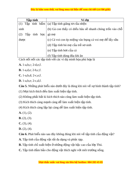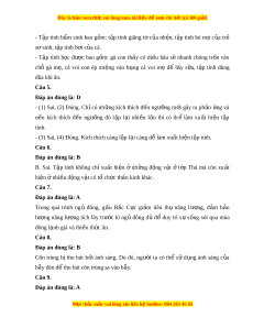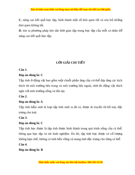 Đây là bản xem th , vu ử i lòng mua tài li u ệ đ xe ể m chi ti t (c ế ó l i ờ gi i ả ) D. T p ậ tính liên quan m t ậ thi t ê đ n ê s ự t n ồ t i ạ và phát tri n ể noi gi ng ố c a ủ đ ng ộ v t ậ . Câu 7. T p t ậ ính ng đông ủ g ở âu B c C ă c có vai ự tro là A. giup g u â B c ă C c ự duy trì kh ả năng s ng ố sót qua mua đông l nh ạ giá và thi u ê th c ăn. ứ B. giup g u â B c ă C c ự b o ả v ệ lãnh th ô khi các loài sinh s n ả nhanh chóng vào mua đông. C. giup g u â B c ă C c ự t o ạ nên các m i ố quan h ệ hài hoa, g n ă bó trong qu n â thể gâu B c ă c c. ự D. giup g u â B c ă C c ự tr n ố tránh kh i o nh ng ư k ẻ thu nguy hi m ể xu t â hi n ệ vào mua đông. Câu 8. C s ơ khoa h ở c ọ c a bi ủ n pháp dung đèn đ ệ ể b y côn t ẫ rung d a t ự rên A. t p t ậ ính s ánh s ơ áng c a côn t ủ rung. B. t p ậ tính b t i hu hut b i ở ánh sáng c a ủ côn trung. C. t p t ậ ính s nhi ơ t ệ đ t ộ a r o a t đèn c ừ a ủ côn trung. D. t p t ậ ính b t i hu hut b i ở nhi t ệ c a ủ côn trung. Câu 9. C s ơ khoa h ở c ọ c a bi ủ n pháp đ ệ t ặ bu nhìn trên đ ng r ồ u ng ộ d a t ự rên A. t p t ậ ính s và t ơ ránh xa con ngư i ờ c a ủ đ ng v ộ t ậ phá ho i ạ mua màng. B. t p ậ tính s và t ơ ránh xa r m ơ c a ủ đ ng v ộ t ậ phá ho i ạ mua màng. C. t p t ậ ính b t i hu hut b i ở mui r m ơ c a ủ đ ng v ộ t ậ phá ho i ạ mua màng. D. t p ậ tính s ơ và tránh xa ngu n ồ phát ra âm thanh c a ủ đ ng ộ v t ậ phá ho i ạ mua màng. Câu 10. Trong h c ọ t p, ng ậ ư i ờ ta có th v ể n d ậ ng u t p t ậ ính để A. tìm ra th i ờ đi m ể h c ọ t p ậ trong ngày phu h p ơ nh t â đ i ố v i ớ m i ỗ cá nhân để nâng cao k t ê qu h ả c t ọ p. ậ B. t o ạ ra không gian h c ọ t p ậ tho i ả mái và phu h p ơ nh t â đ i ố v i ớ m i ỗ cá nhân để nâng cao k t ê qu h ả c t ọ p. ậ M i