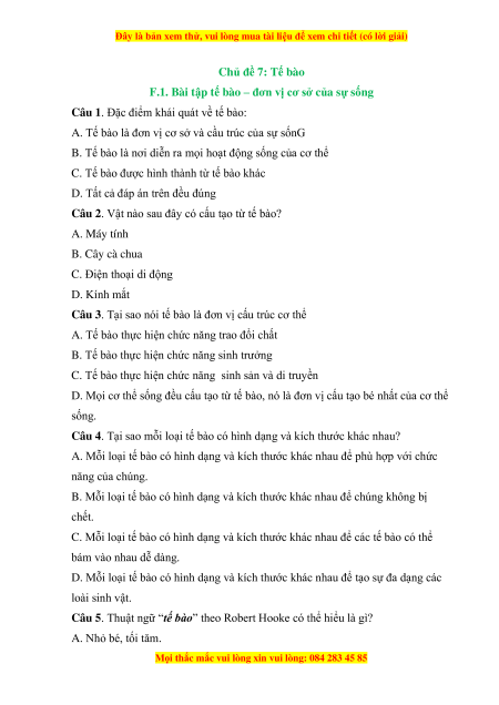 F.1. Bài tập tế bào – đơn vị cơ sở của sự sống