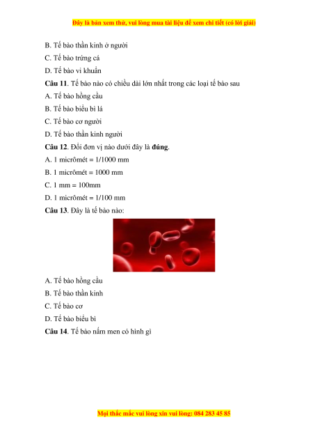 Câu 11. Tế bào nào có chiều dài lớn nhất trong các loại tế bào sau A. Tế bào hồng cầu B. Tế bào biểu bì lá C. Tế bào cơ người