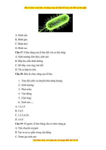 Câu 17. Chức năng của tế bào đối với cơ thể sống: