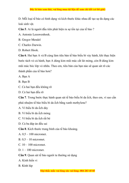 Câu 5. Ai là người đầu tiên phát hiện ra sự tồn tại của tế bào ? A. Antonie Leeuwenhoek. B. Gregor Mendel C. Charles Darwin. D. Robert Hook.