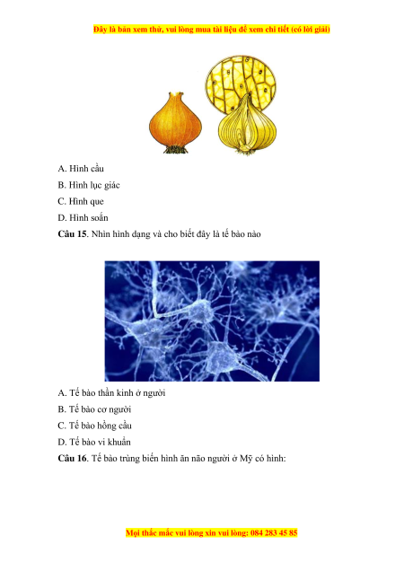 Câu 13. Tế bào xương có dạng hình gì? A. Hình liềm. B. Hình cầu. C. Hình sao. D. Hình đĩa lõm.