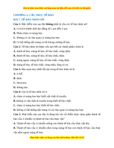 C. Không có cac bào quan có màng bao b c. ọ D. Có hê thông n i ô màng và b khung x ô ư ng t ơ bào. ế Câu 2: T bào ế nhân sơ đư c c ợ u t ấ o b ạ i ở cac thành ph n chí â nh là A. thành t bào, ế màng t bào, t ế bào ch ế ất, vùng nhân. B. thành t bào, ế màng t bào, ế t bào ch ế t ấ , nhân.