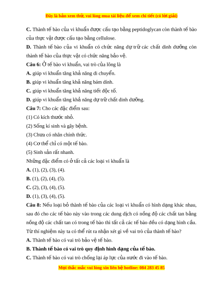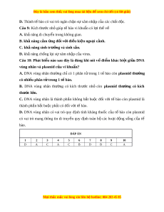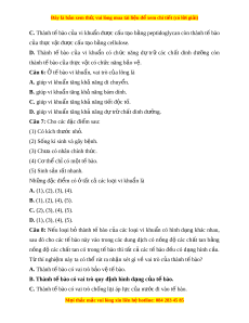 (2) Sông kí sinh và gây b nh. ê (3) Ch a có nhân ư chính th c. ư (4) C t ơ h ch ể có m ỉ t ô t bào. ế (5) Sinh s n r a t ấ nhanh. Nh ng ư đ c đi ặ m ể có ở t t ấ ca cac lo i ạ vi khu n â là A. (1), (2), (3), (4). B. (1), (2), (4), (5). C. (2), (3), (4), (5). D. (1), (3), (4), (5). Câu 8: N u ế lo i ạ bỏ thành tế bào c a ủ cac lo i ạ vi khu n â có hinh d ng ạ khac nhau,