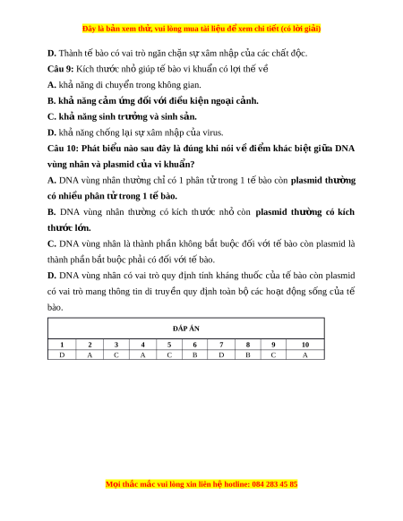 D. Thành t bào có vai ế tro ngăn ch n ặ s xâm ư nh p c â a ủ cac ch t ấ đ c. ô Câu 9: Kích thư c nh ớ gi ỏ up t bào vi ế khu n có l â i ợ th v ế ê A. kh năng di a chuy n t ể rong không gian. B. khả năng c m ả ng đ ư i ô v i ơ đi u ki ê n ngo ệ i a c nh. ả