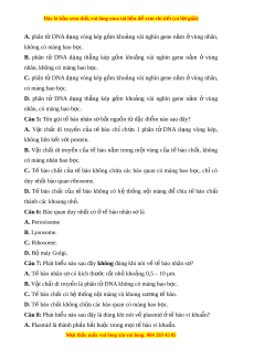 nhân, không có màng bao b c. ọ C. phân tử DNA d ng ạ vòng kép g m ồ kho ng a vài nghìn gene n m ằ ở vùng nhân, có màng bao b c. ọ D. phân tử DNA d ng ạ th ng ă kép g m ồ kho ng a vài nghìn gene n m ằ ở vùng nhân, có màng bao b c. ọ Câu 5: Tên g i ọ t bào nhân ế s b ơ t ă nguồn t đ ư c đi ă m ê nào sau đây? A. V t ậ ch t ấ di truy n ề c a ủ t ế bào ch ich a ư 1 phân t ử DNA d ng ạ vòng kép, không liên k t ế v i ớ protein. B. V t ậ ch t ấ di truy n ề c a ủ t ế bào n m ằ trong m t ộ vùng c a ủ t ế bào ch t ấ , không có màng nhân bao b c. ọ C. T ế bào ch t ấ c a ủ t ế bào không ch a