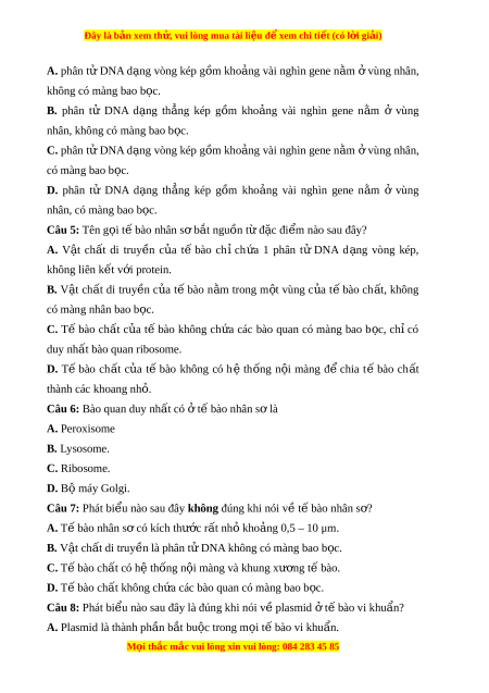 Đây là bản xem th , vu ử i lòng mua tài li u ệ đ xe ể m chi ti t (c ế ó l i ờ gi i ả ) A. phân tử DNA d ng ạ vòng kép g m ồ kho ng a vài nghìn gene n m ằ ở vùng nhân, không có màng bao b c. ọ B. phân tử DNA d ng ạ th ng ă kép g m ồ kho ng a vài nghìn gene n m ằ ở vùng