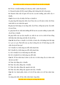 C. Plasmid là phân t D ử NA m ch ạ th ng, ă nh , không l o iên k t ế v i ớ protein. D. Plasmid ch a ư m t ộ s ố gene h ô tr ơ cho s ự sinh trư ng, ở phat tri n ê c a ủ vi khuẩn. Câu 9: Vai trò c a v ủ nh o y ầ t ở bào vi ế khu n l ẩ à A. giúp tăng kh a năng bam dinh c a ủ t ế bào trên cac b ề m t ă và b o a v ệ t ế bào tranh kh i o cac tac nhân bên ngoài. B. giúp t o ạ hình d ng ạ và s ự c ng ư ch c ă c a ủ t ế bào, ch ng ố l i ạ ap l c ự c a ủ nư c ớ đi vào t bào. ế C. giúp d ự tr ư cac ch t ấ dinh dư ng ơ đ ê h ô tr ơ cho s ự sinh trư ng ở và phat tri n ê c a t ủ bào ế vi khuẩn. D. giúp ki m ê soat s ự v n ậ chuy n ê cac ch t ấ đi vào và đi ra kh i o t ế bào đ ng ồ th i ở đ m a b o a kh năng s a inh đ c t ộ c ố a t ủ bào. ế Câu 10: Hai t ế bào vi khu n ẩ A và B đ u ề có hình c u ầ v i ớ đư ng ơ kinh l n ầ lư t ơ là 1 μm và 2 μm. Phat bi u