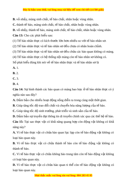 Câu 14: Sự hình thành cac bào quan có màng bao b c ọ ở t ế bào nhân th c ự có ý nghĩa nào sau đây? A. Đ m a b o cho nhi a u ề ho t ạ đ ng s ộ ống di n r ễ a trong cùng m t ộ th i ơ gian.