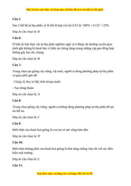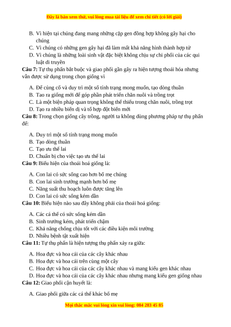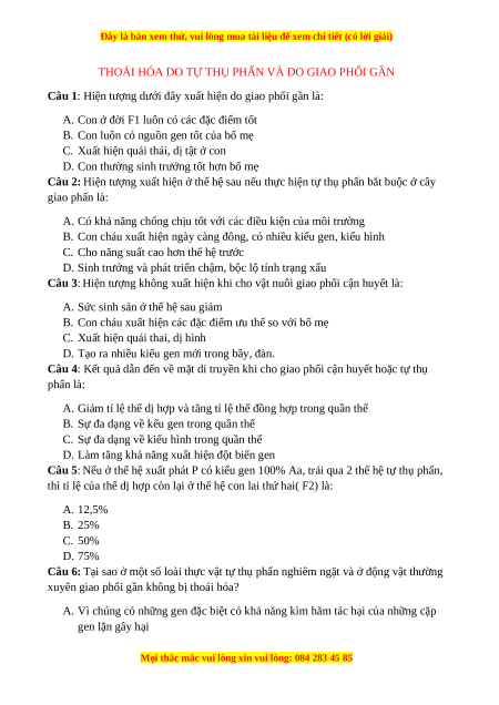 phối gần không bị thoái hóa vì hiện tại chúng đang mang những cặp gen đồng hợp không gây hại cho chúng. Đáp án cần chọn là: B Câu 7: