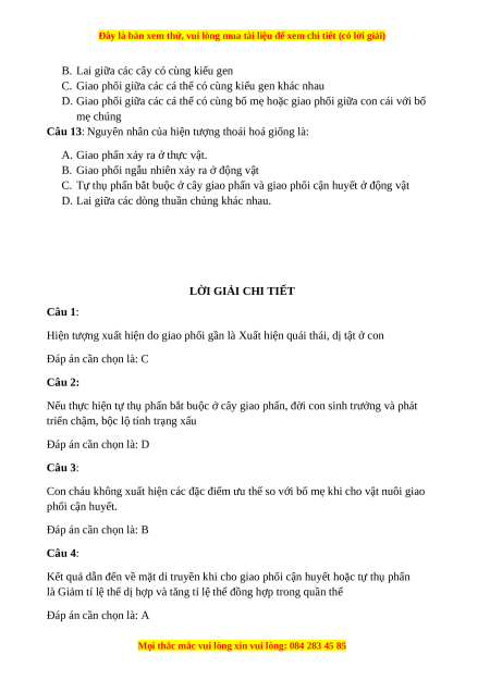 Hiện tượng xuất hiện do giao phối gần là Xuất hiện quái thái, dị tật ở con Đáp án cần chọn là: C Câu 2: