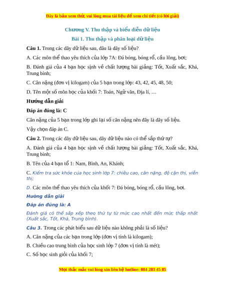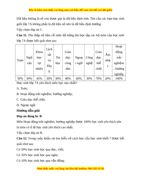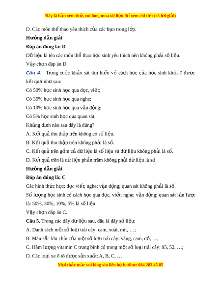 Đây là bản xem th , vu ử i lòng mua tài li u ệ đ xe ể m chi ti t (c ế ó l i ờ gi i ả ) D. Các môn th t ể hao yêu thích c a ủ các b n ạ trong l p. ớ Hư ng d ớ ẫn gi i ả Đáp án đúng là: D Dữ li u l ệ à tên các môn th t ể hao h c s