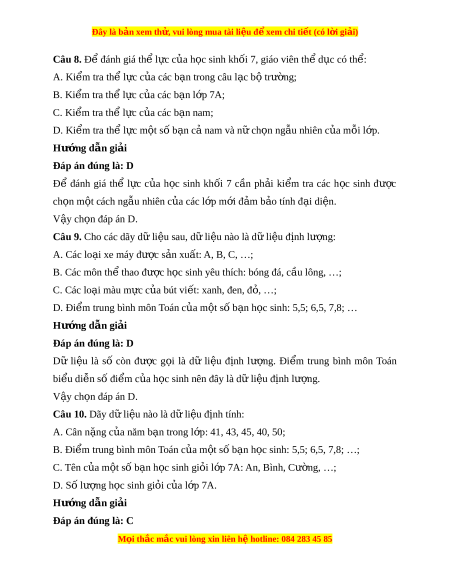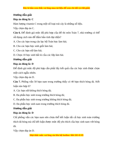 ủ đề thi môn Toán 7, nhà trư ng ờ có thể sử d ng cách ụ nào đ đ ể m ả b o ả tính đ i ạ di n? ệ A. Cho các b n ạ trong câu l c b ạ ộ Toán h c l ọ àm bài; B. Cho các b n h ạ c ọ sinh gi i ỏ làm bài; C. Cho các b n n ạ l ữ àm bài; D. Ch n 10 h ọ c s ọ inh b t ấ kì c a ủ các l p ớ làm bài. Hư ng d ớ ẫn gi i ả Đáp án đúng là: D Để đánh giá m c ứ độ phù h p ợ c n ầ ph i ả l y ấ k t ế qu ả c a ủ các h c ọ sinh đư c ợ ch n ọ m t ộ cách ngẫu nhiên. V y ậ ch n đáp án ọ D. Câu 7. Ph ng ỏ v n ấ 50 b n ạ nam trong trư ng ờ th y ấ có 40 b n ạ thích bóng đá. K t ế lu n ậ nào h p l ợ í? A. Các b n ạ n không t ữ hích bóng đá; B. Đa ph n h ầ c s ọ inh trong trư ng t ờ hích bóng đá; C. Đa ph n h ầ c s ọ inh trong trư ng không t ờ hích bóng đá; D. Đa ph n h ầ c ọ sinh nam trong trư ng ờ thích bóng đá. Hư ng d ớ ẫn gi i ả Đáp án đúng là: D Chỉ ph ng ỏ v n ấ các b n ạ nam nên ch a ư thể k t ế lu n ậ t t ấ cả h c ọ sinh toàn trư ng ờ thích đá bóng mà ch k ỉ t ế lu n ậ đư c ợ m c đ ứ yêu t ộ hích c a ủ h c s ọ inh nam v i ớ bóng đá. V y ậ ch n đáp án ọ D. M i