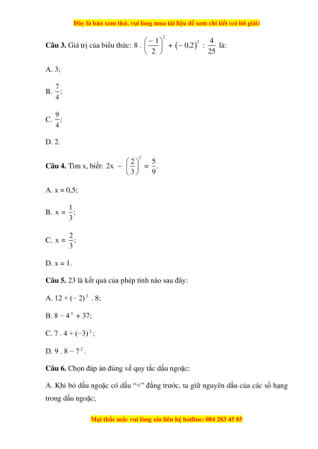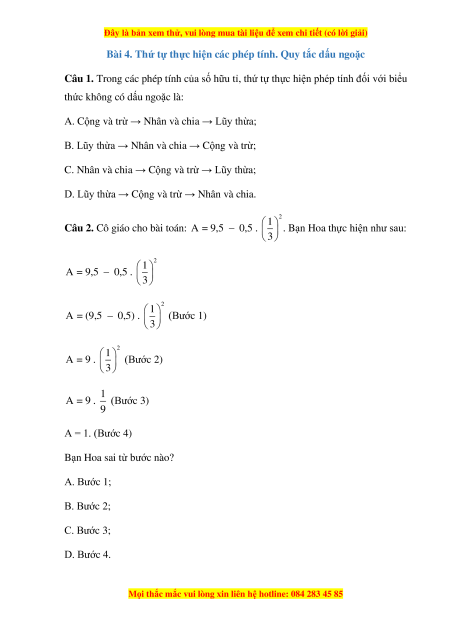 Câu 1. Trong các phép tính của số hữu tỉ, thứ tự thực hiện phép tính đối với biểu
