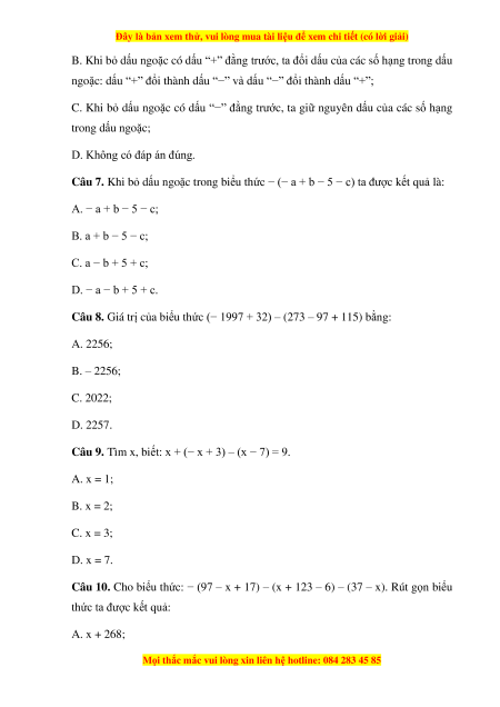 Câu 10. Cho biểu thức: − (97 – x + 17) – (x + 123 – 6) – (37 – x). Rút gọn biểu