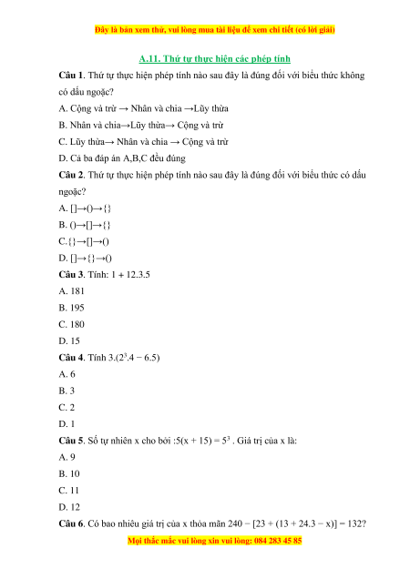 Câu 2. Thứ tự thực hiện phép tính nào sau đây là đúng đối với biểu thức có dấu ngoặc? A. []→()→{} B. ()→[]→{} C.{}→[]→() D. []→{}→()