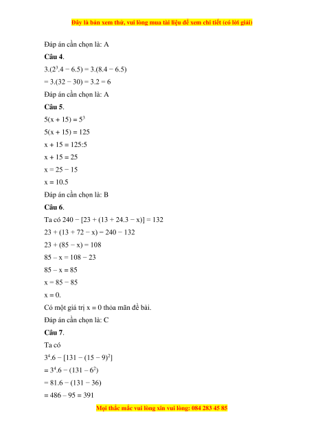 3.(23.4 − 6.5) = 3.(8.4 − 6.5) = 3.(32 − 30) = 3.2 = 6 Đáp án cần chọn là: A Câu 5. 5(x + 15) = 53 5(x + 15) = 125 x + 15 = 125:5 x + 15 = 25 x = 25 − 15 x = 10.5 Đáp án cần chọn là: B Câu 6.