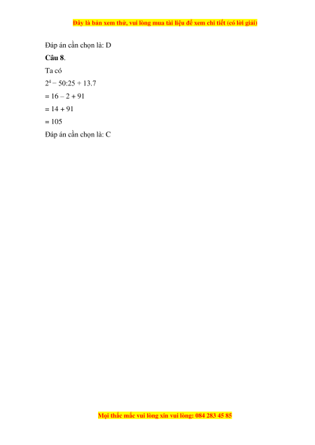 Đáp án cần chọn là: D Câu 8. Ta có 24 − 50:25 + 13.7 = 16 – 2 + 91 = 14 + 91 = 105 Đáp án cần chọn là: C