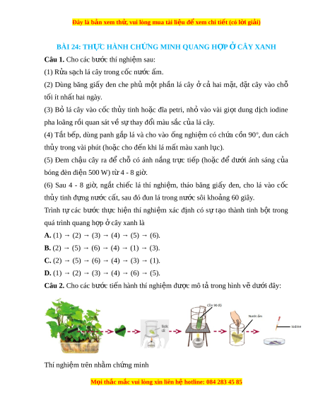 Câu 1. Cho các bư c t ớ hí nghi m ệ sau: (1) R a ử s ch ạ lá cây trong c c n ố ư c ớ m ấ . (2) Dùng băng gi y ấ đen che phủ m t ộ ph n ầ lá cây ở cả hai m t ặ , đ t ặ cây vào chỗ tối ít nh t ấ hai ngày. (3) Bỏ lá cây vào c c ố th y ủ tinh ho c ặ đĩa petri, nh ỏ vào vài gi t ọ dung d ch ị iodine pha loãng r i ô quan sát v s ê t ư hay đôi màu s c ă c a l ủ á cây. (4) T t ă b p, ế dùng panh g p ă lá và cho vào ng ố nghi m ệ có ch a ứ c n ô 90o, đun cách th y t ủ rong vài phút (ho c ặ cho đ n khi ế lá m t ấ màu xanh l c) ụ . (5) Đem ch u
