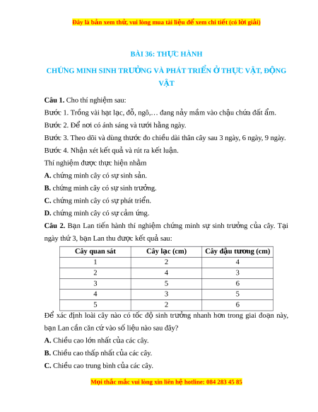 Đây là bản xem th , vu ử i lòng mua tài li u ệ đ xe ể m chi ti t (c ế ó l i ờ gi i ả ) BÀI 36: TH C Ự HÀNH CH N Ứ G MINH SINH TRƯ N Ở G VÀ PHÁT TRI N Ể Ở TH C Ự V T Ậ , Đ N Ộ G VẬT Câu 1. Cho thi nghi m ê sau: Bư c ớ 1. Trồng vài h t ạ l c, ạ đ , ngô,… đang ỗ n y m ả m ầ vào ch u ch ậ a ứ đ t ấ m ẩ . Bư c ớ 2. Đ n ể i ơ có ánh sáng và tư i ớ h ng ngày ằ . Bư c