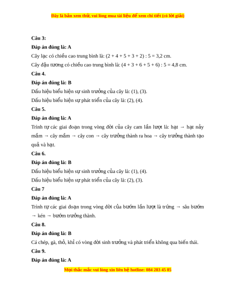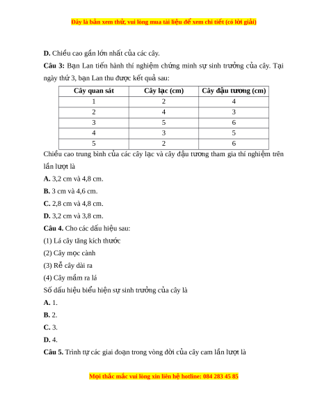 Đây là bản xem th , vu ử i lòng mua tài li u ệ đ xe ể m chi ti t (c ế ó l i ờ gi i ả ) D. Chi u cao ề gần l n ớ nh t ấ c a ủ các cây. Câu 3: B n ạ Lan ti n ế hành thi nghi m ê ch ng ứ minh sư sinh trư ng ở c a ủ cây. T i ạ ngày th 3, b ứ n ạ Lan thu đư c ơ k t ế qu s ả au: Cây quan sát Cây lạc (cm) Cây đậu tư ng ( ơ cm) 1 2 4 2 4 3 3 5 6 4 3 5 5 2 6 Chi u ề cao trung binh c a ủ các cây l c ạ và cây đ u ậ tư ng ơ tham gia thi nghi m ê trên lần lư t ơ là A. 3,2 cm và 4,8 cm. B. 3 cm và 4,6 cm. C. 2,8 cm và 4,8 cm. D. 3,2 cm và 3,8 cm.