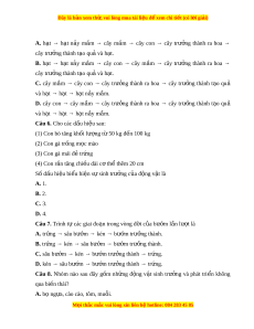 ứ minh cây có sư sinh trư ng. ở C. ch ng m ứ inh cây có s phát ư tri n. ể D. ch ng m ứ inh cây có s c ư m ả ng. ứ Câu 2. B n ạ Lan ti n ế hành thi nghi m ê ch ng ứ minh sư sinh trư ng ở c a ủ cây. T i ạ ngày th 3, b ứ n ạ Lan thu đư c ơ k t ế qu s ả au: Cây quan sát Cây lạc (cm) Cây đậu tư ng ( ơ cm) 1 2 4 2 4 3 3 5 6 4 3 5 5 2 6 Để xác đ nh i loài cây nào có t c ố độ sinh trư ng ở nhanh h n ơ trong giai đo n ạ này, b n L ạ an c n căn c ầ vào s ứ ố li u nào s ê au đây? A. Chi u cao ề l n nh ớ t ấ c a ủ các cây. B. Chi u ề cao th p nh ấ t ấ c a ủ các cây. C. Chi u cao ề trung binh c a ủ các cây. M i