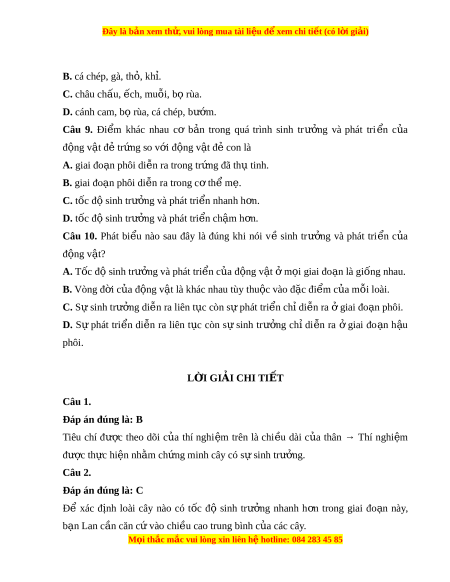 ậ là khác nhau tùy thu c vào đ ộ c ă đi m ể c a m ủ i ỗ loài. C. S s ư inh trư ng di ở n r ê a liên t c con s u phát ư tri n ch ể di i n r ê a gi ở ai đo n phôi ạ . D. S ư phát tri n ể di n ê ra liên t c u con s ư sinh trư ng ở ch idi n ê ra ở giai đo n ạ h u ậ phôi. LỜI GIẢI CHI TI T Ế Câu 1.